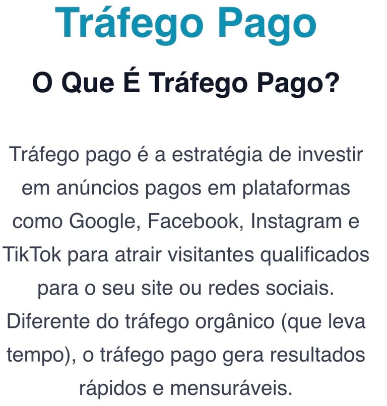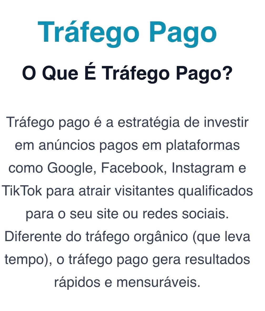 O tráfego pago é a estratégia de atrair clientes por meio de anúncios online, como Google Ads, Facebook Ads e Instagram Ads.